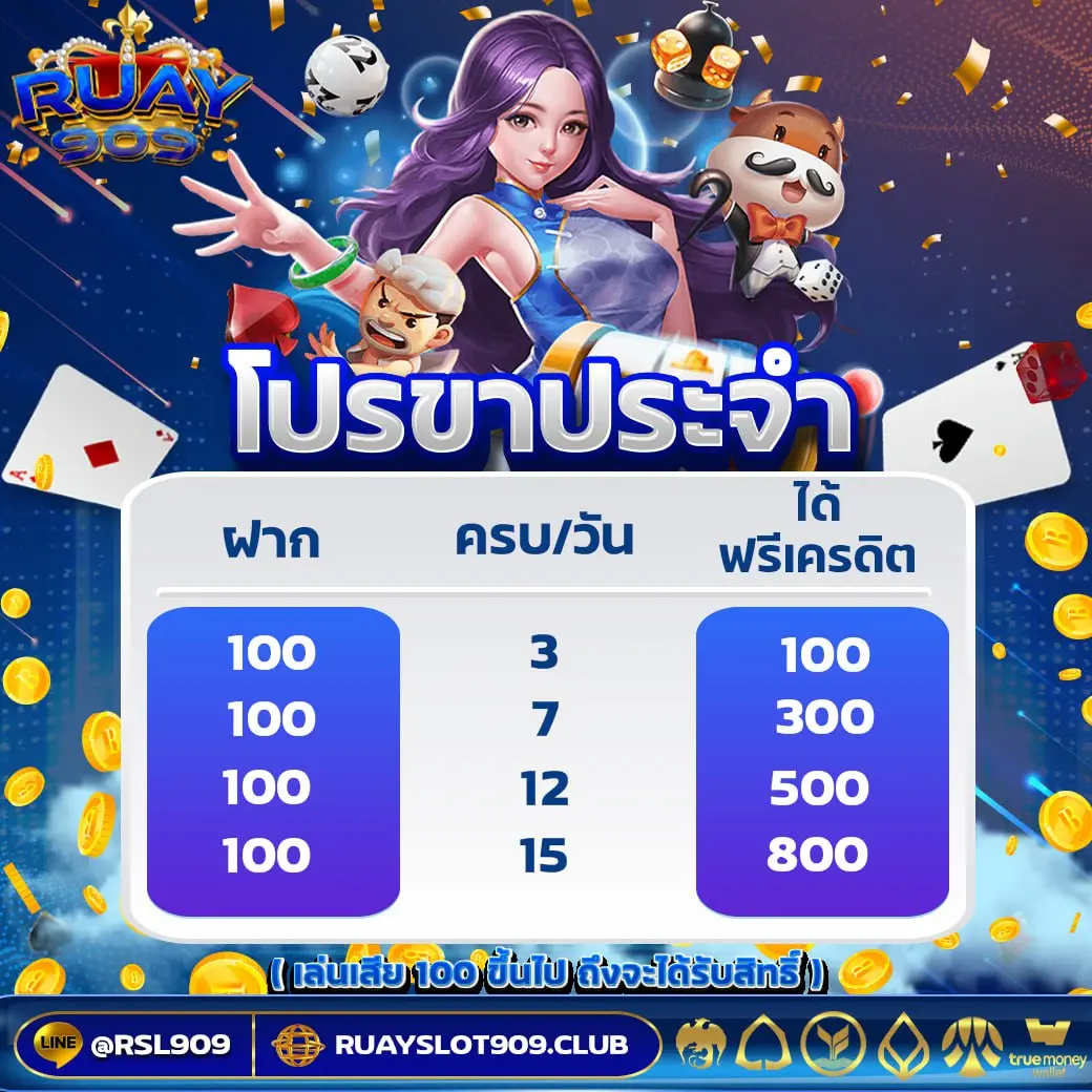 RUAY SLOT 909 เราคือผู้ให้บริการเกมเดิมพันคาสิโนออนไลน์ทุกรูปแบบครบวงจร ไม่ว่าจะเป็นเกมการเดิมพันบาคาร่า เกมเดิมพันคาสิโนออนไลน์ รวมไปถึงคาสิโนสด สล็อตออนไลน์ หวย เกมกีฬา และเกมเดิมพันสนุกๆ อีกมากกว่า 300 เกม ถูกรวบรวมไว้ที่ RUAY SLOT 909 สนใจอยากเล่นเกมเดิมพันออนไลน์ สามารถสมัครเข้าร่วมเล่นเกมเดิมพันได้ง่ายๆ พร้อมรับโบนัสมากมาย เราคือผู้ให้บริการเกมคาสิโนออนไลน์ครบวงจร ให้บริการเกมคาสิโนชั้นนำระดับโลกมากมายกว่า 21 ชนิด ด้วยแพลตฟอร์มที่ได้มาตรฐาน ปลอดภัย รองรับทั้งคอมพิวเตอร์ และมือถือ สมาร์ทโฟนที่พร้อมจะให้ประสบการณ์เล่นพนันออนไลน์ที่เหนือกว่าแก่คุณ